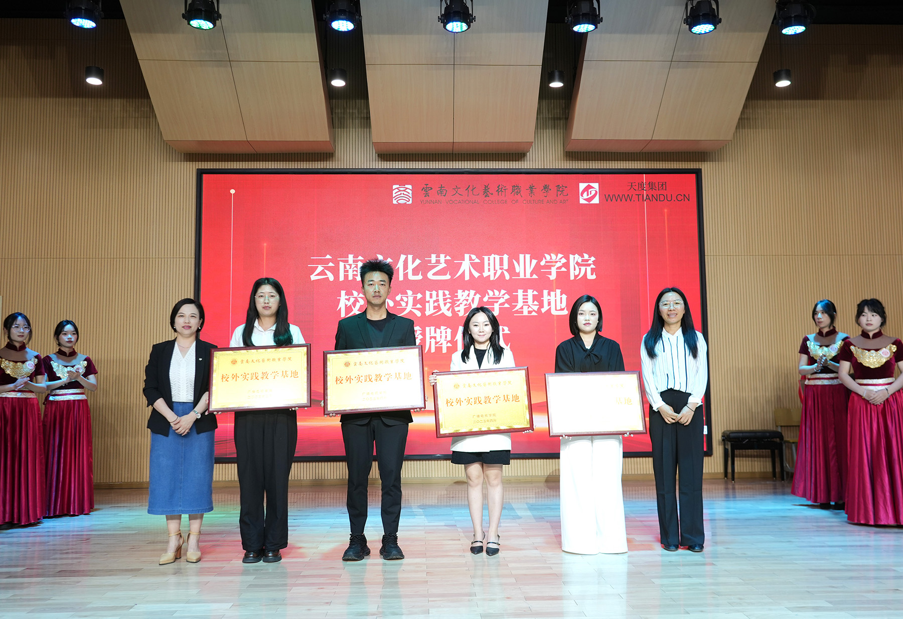 孙鹤瑜副院长、刘悦副院长为云南云纺科技产业园有限公司、云南猎狐网络科技有限公司、云南星联汇企业管理有限公司、 云南春雨华飞商业运营管理有限公司四家实习实训基地代表企业授牌,进一步推动学校与企业开展多层次、多形式、多领域的合作,为共同培养社会需要的优秀人才提供契机。